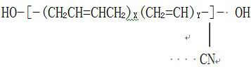端羥基聚丁二烯丙烯腈(簡稱丁腈羥,英文縮寫HTBN)是以丁二烯-丙烯腈為主鏈,分子鏈端帶有羥基的遙爪聚合物。是一種性能優(yōu)異的合成高分子材料,是液體橡膠系列產(chǎn)品之一?;瘜W結構式如下: